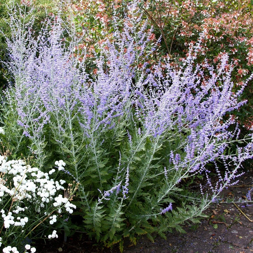 With its aromatic leaves and upright spikes of violet-blue flowers, Russian sage makes a wonderful companion to all kinds of late-summer ornamental grasses and perennials. In August and September, tiny, violet-blue, tubular flowers appear on silver-grey spikes above the main framework of the plant, among deeply-cut and lobed, grey-green leaves. This deciduous sub-shrub makes a real impact planted en masse alongside a path, where the sage-like fragrance of its leaves can be appreciated, or try it alongside other silver-leaved plants, or in swathes in a sunny border. One of our recommended plants, it copes well with dry, chalky soil and salt-laden air.